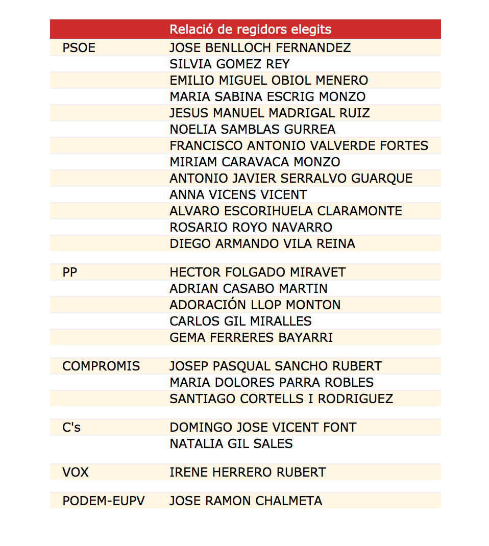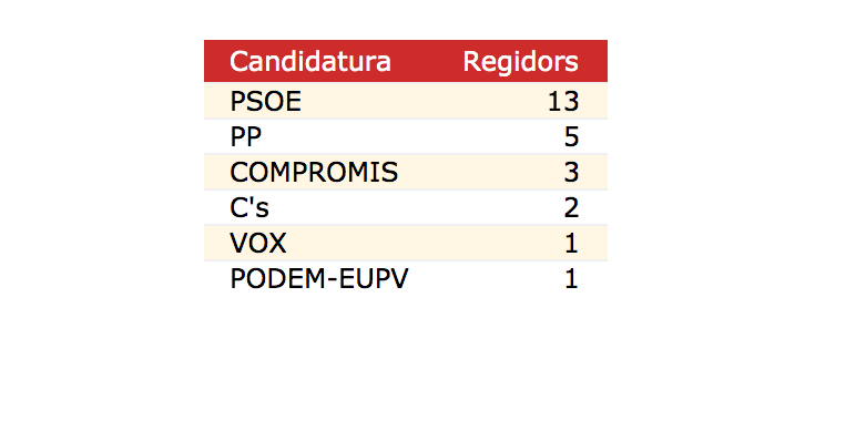 Vox i Podem entren a l’Ajuntament amb un regidor cadascun i el candidat socialista dóna la mà a Compromís i Podem per a formar un “govern de progrés com els de Madrid i València”. Així mateix, en la resta de formacions, cares llargues, ja que PP i Compromís obtenen mals resultats, els populars baixen de sis a cinc, Compromís passa de quatre a tres i Cs es manté amb dos i es congratula d’haver-hi augmentat 500 vots. La formació de Vicent fins a l’últim moment s’ha batut en una lluita amb la coalició per a obtenir el tercer regidor