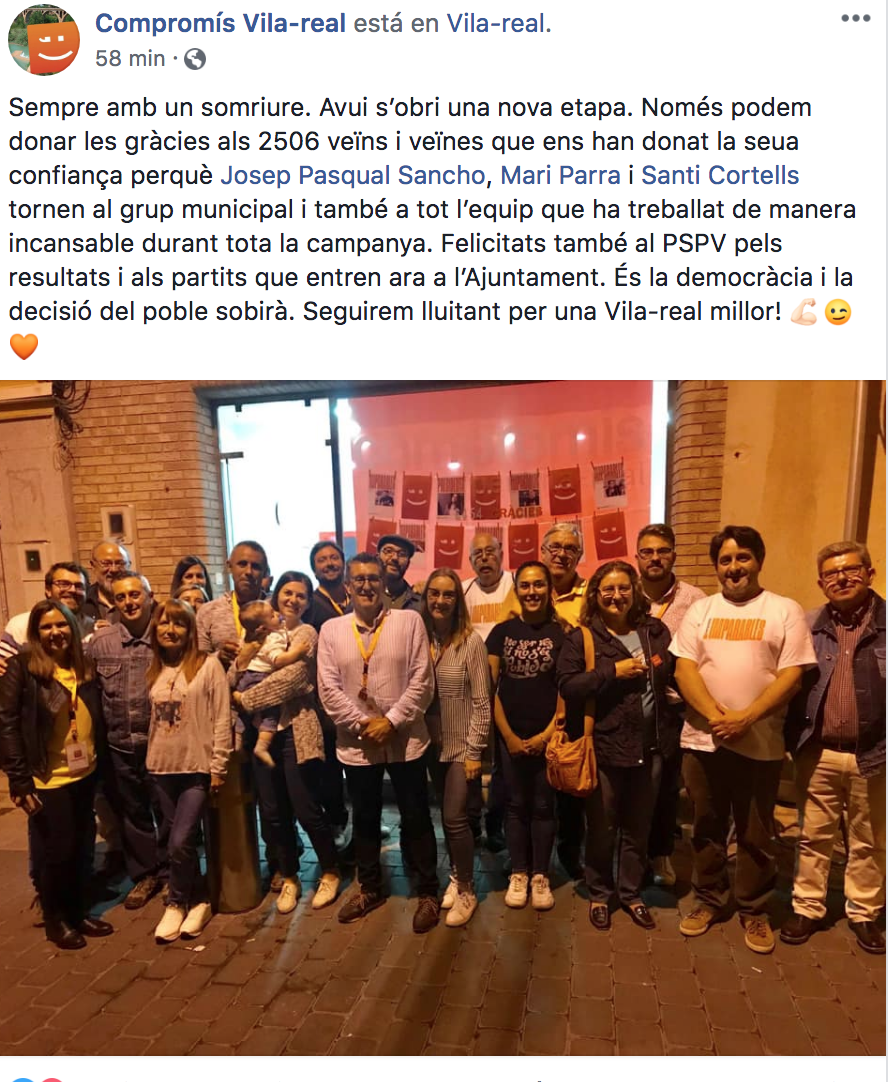 Només podem dir GRÀCIES a tots els veïns que avui, tenint moltes altres opcions sobre la taula, han triat la papereta de Compromís per Vila-real quan han anat al col·legi electoral. Una confiança que, tot i haver-se traduït en un menor nombre de regidors –un menys que al 2015-, agraïm eternament i volem fer-los saber que el seu vot no quedarà en el no-res, perquè a partir del proper 15 de juny anem a treballar de valent i amb obstinació per allò que ens mou: l’objectiu de millorar la vida de les persones. Ara s’obri un període de reflexió, però tenim clar que anem a deixar-nos la pell per Vila-real.