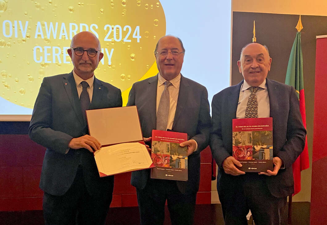 La Organización Internacional del Vino y la Viña (OIV) ha entregado a la publicación de Cajamar 'El vino de alta gama en España. En el camino de la excelencia' el premio a la mejor obra del año en la categoría de 'Monografías y Estudios Especializados'. En la ceremonia celebrada en el Centro Cultural de Belém, en Lisboa (Portugal), recogieron el galardón los coordinadores de la obra Carlos Moro, presidente de Bodegas Familiares Matarromera; Raúl Compés, director del Instituto Agronómico Mediterráneo de Zaragoza (CIHEAM), y Vicente Sotés, catedrático emérito de viticultura de la Universidad Politécnica de Madrid.