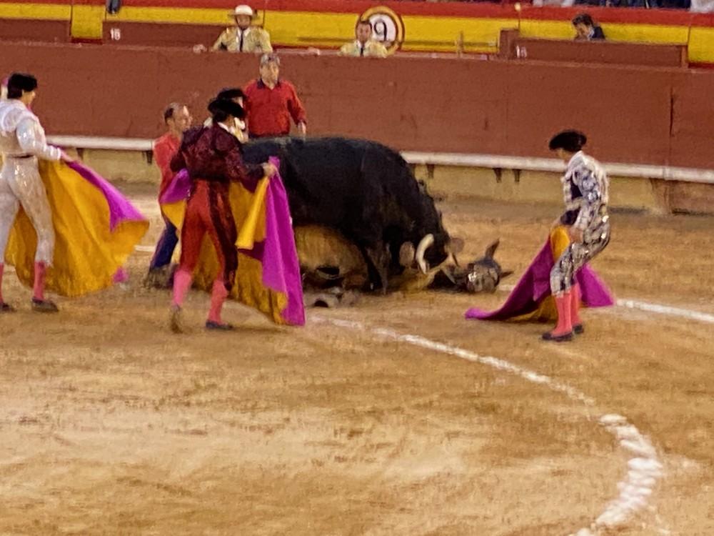 Cuando por fin consiguieron quitarle al toro de encima, todavía hubo que examinar al caballo. Y no, no estaba muerto, solo aterrado. Con muchos esfuerzos consiguieron levantarlo y el animal fue llevado fuera del ruedo.