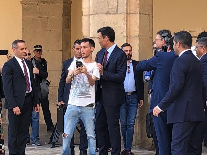 Lo anecdótico: Lo que llamó más la atención… entro otras cosas… fue el férreo control que se ejerció sobre los medios de comunicación, mientras el público o los vecinos que circulaban por la zona, tanto en la plaza como en la calle Mayor, se colaban sin problemas… de esta forma, un joven se coló sin miramientos, a la salida del Ayuntamiento, se colocó delante de Sánchez y le dijo, "¡Presidente! ¡un selfi!… y se hizo la foto con el presidente.