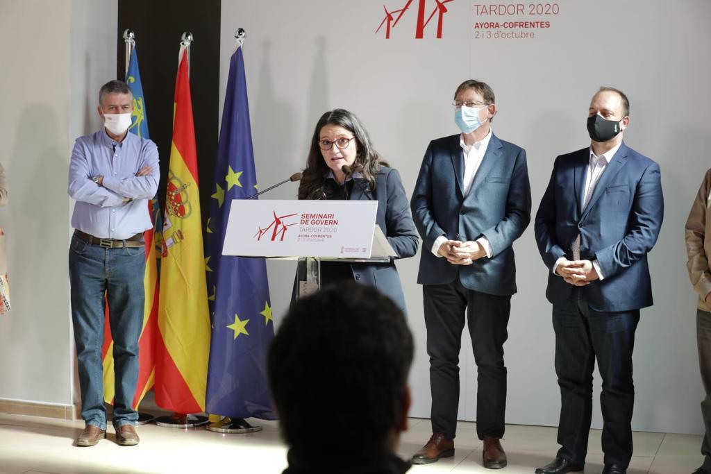 Por su parte, la vicepresidenta del Consell, Mónica Oltra, ha destacado que el Seminari de Govern de Ayora-Cofrentes supone un nuevo ejercicio de autoevaluación y ha puesto en valor las cohesión del Gobierno valenciano para actuar de forma decidida contra la pandemia. La vicepresidenta ha desgranado los principales objetivos de cada conselleria para el próximo semestre