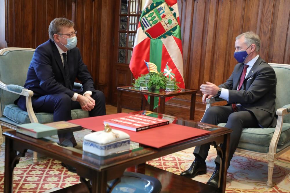 El president de la Generalitat, Ximo Puig, y el lehendakari del Gobierno vasco, Íñigo Urkullu, han acordado intensificar la cooperación para desarrollar proyectos conjuntos con fondos de la UE y han pedido también una respuesta europea que permita mitigar el impacto económico de la guerra de Ucrania en el alza de los costes energéticos.