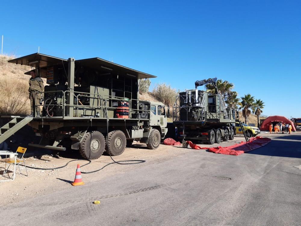 Del mismo modo también se ha contado con un furgón de riesgo químico, material de contención de derrame, remolque nodriza y maquinaria pesada, además del despliegue de vehículos de intervención de bomberos y fuerzas de orden público.