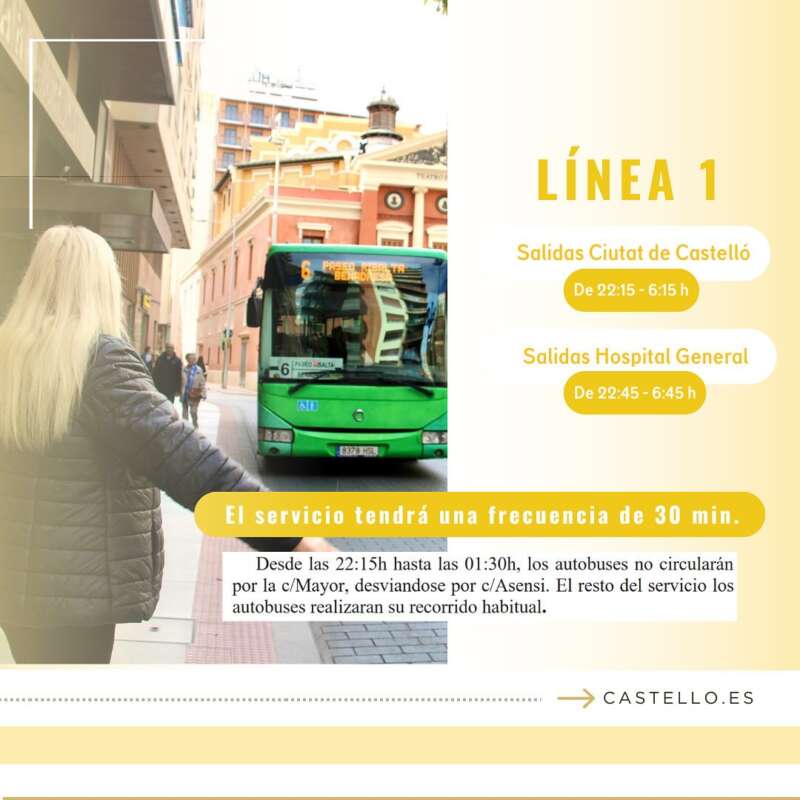 Concretamente, la línea N1 ampliará su horario y estará activo durante la noche. Las salidas del Polideportivo Ciudad de Castelló serán desde las 22:15 y transcurrirán hasta las 06:15 de la mañana; y desde el Hospital General darán comienzo desde las 22:45 hasta las 06:45, con una frecuencia de 30 minutos.