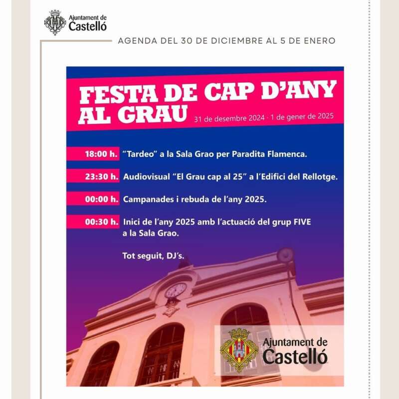 Los graueros podrán volver a la Sala Grao para, a las 0:30 horas realizar la celebración del inicio del año 2025 con la actuación del grupo Five y después música Dj’s.
