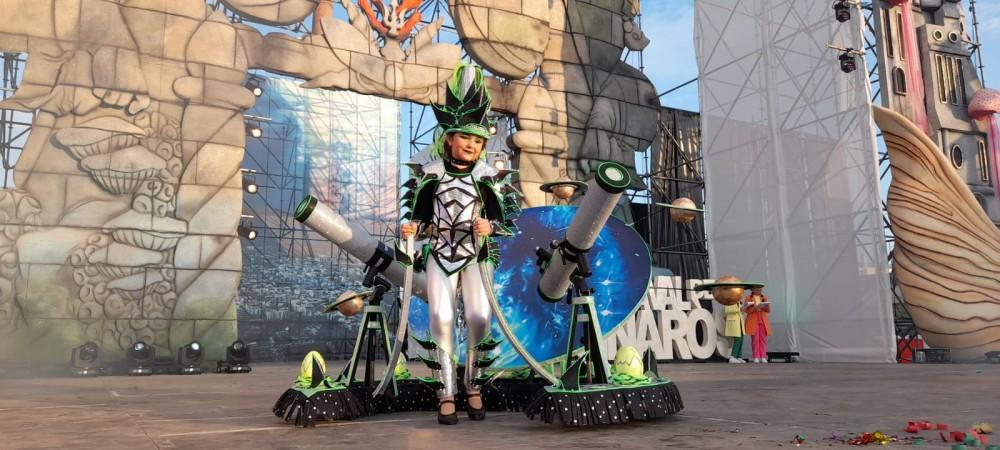 Las reinas y reyes infantiles de las comparsas que han decidido tener representantes infantiles, recordar que son 31, han dado a conocer sus fantasías, en medio de un espectáculo de luces y música. Disfraces que pese a ser muchos más reducidos, están muy elaborados y con mucha fantasía.