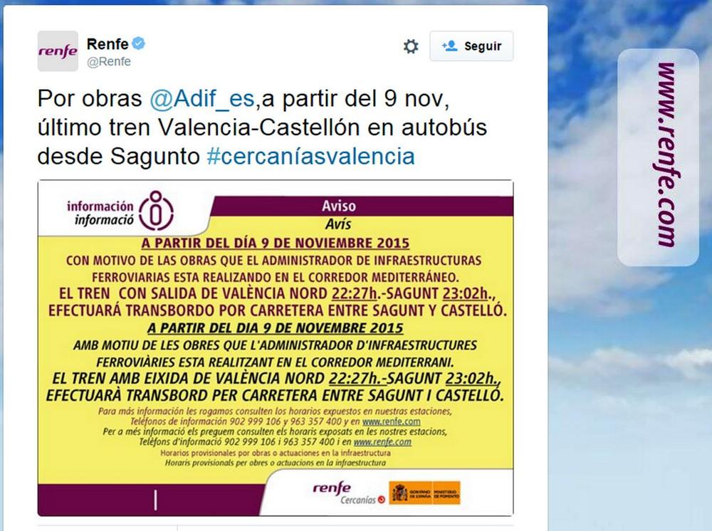 Puestos en contacto con la empresa, ésta ha confirmado que el servicio de las 22:47 de Cercanías no ha sido suprimido oficialmente, y prueba de ello, es el anuncio realizado en Twitter, del que son conocedores los agentes de comercialización de los billetes de Cercanías. En la Web de Renfe, sección de ‘avisos’, también se pueden consultar los horarios completos de enlace entre Valencia y Castellón, donde si aparece este tren.