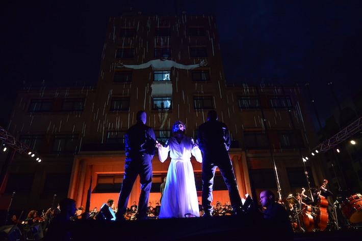 La plaça Major, un escenari a l’aire lliure immillorable, s’hi ha omplit de gom a gom, com era previsible, per a gaudir d’aquest espectacle artístic davant de tot i multidisciplinari. Però a més de la música, la interpretació, els elements audiovisuals, el silenci, que no ha de ser menyspreat, les ombres projectades sobre la façana de l’Ajuntament i el foc han jugat un paper més dins del tot de l’obra.