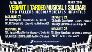 No obstant açò, la Ruta del Vermut i Tardeo no solament comptarà amb actuacions tots els dissabtes, ja que també s'ofereixen tallers mediambientals per a xiquets en el mateix horari, amb l'objectiu que els més menuts puguen gaudir d'activitats especialment pensades per a ells mentre els seus pares gaudeixen de la música en directe. Així mateix, la campanya té un objectiu solidari, ja que una part dels beneficis de cada mes es dedicaran a una societat benèfica diferent. Aquest mes de gener, l'associació Conquistando Escalones vendrà la novel·la solidària de l'escriptor vila-realenc Ángel Gil Cheza La lluvia es una canción sin letra i posteriorment aprofitant la programació.