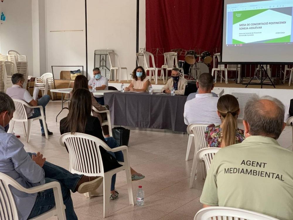La secretaria autonómica de la Conselleria, Paula Tuzón y el director general de Incendios Forestales, Diego Marín, se han reunido con los Ayuntamientos de Azuebar, Soneja y Almedijar; la Diputación de Castelló; el director-conservador del parque natural de la Serra d'Espadà; representantes de la Confederación Hidrográfica del Xúquer, de la Agencia Valenciana de Seguridad y Emergencias; Agentes Medioambientalesa así como otras organizaciones ecologistas y deportivas como SEO-BirdLife o la Federación de Deportes de Montaña.