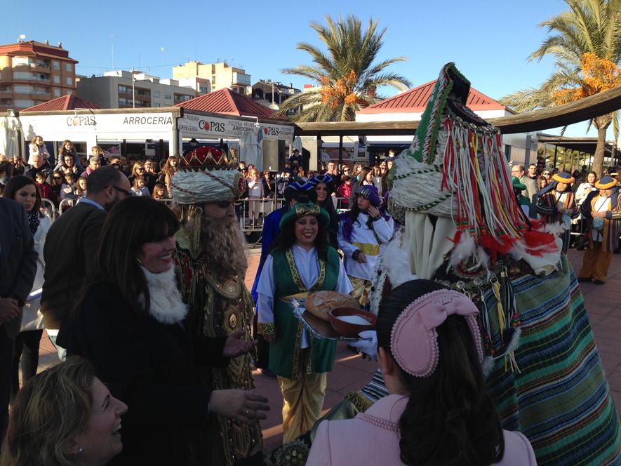 En medio de una expectación increíble, los Magos desembarcaron en la escalera real de la Plaza del Mar. La alcaldesa de Castellón y miembros de la Corporación Municipal, dieron la bienvenida oficial y, cumplieron con las leyes internacionales de la hospitalidad, ofreciendo a sus majestades el pan y la sal.