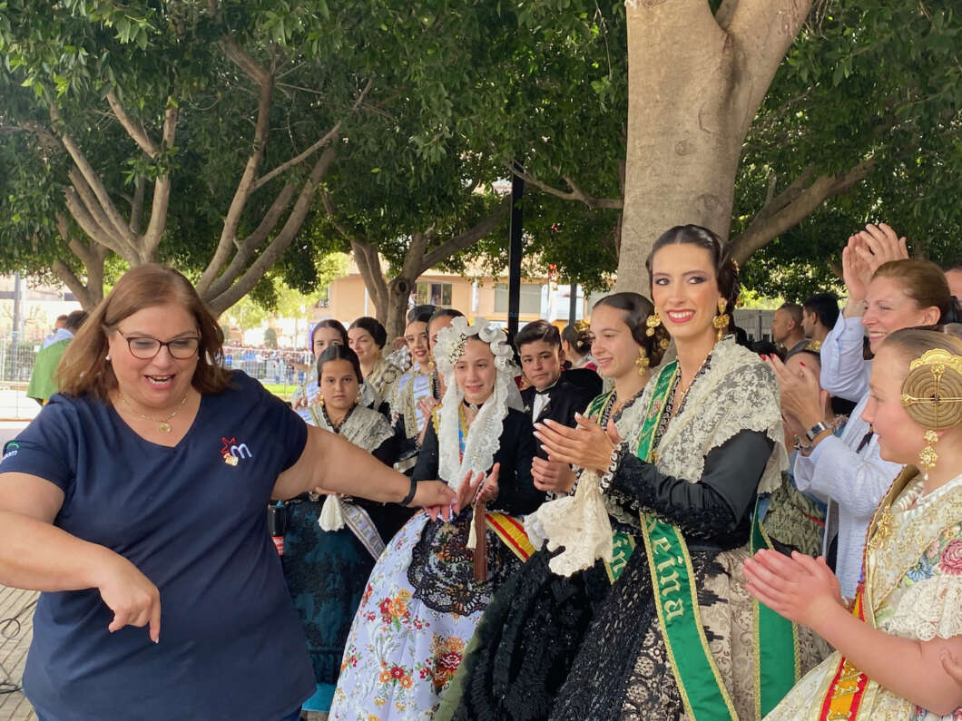 Al son de la música de fiesta la gente bailaba mientras esperaba. El sol picaba fuerte. Hacía calor, tanto que se agradeció la sombra que proporcionan los árboles en la zona oficial del recinto, aunque impida ver parte de la mascletá.
