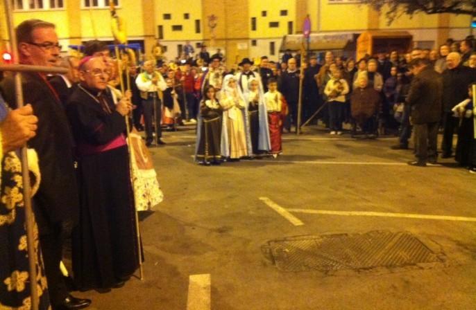 La Plaza Mayor se comenzó a llenar de romeros que recogían sus cañas para el camino y formaban los tradicionales grupos mientras la Colla de Dolçainer y la Banda Municipal ponían la música al inicio de la romería que se producía puntual cuando se abría la puerta principal de la concatedral de Santa María, invitando a que la ciudad, representada por su corporación municipal bajo mazas, con toda la solemnidad del caso, se acercase para invitar a los representantes religiosos a unirse a la romería.