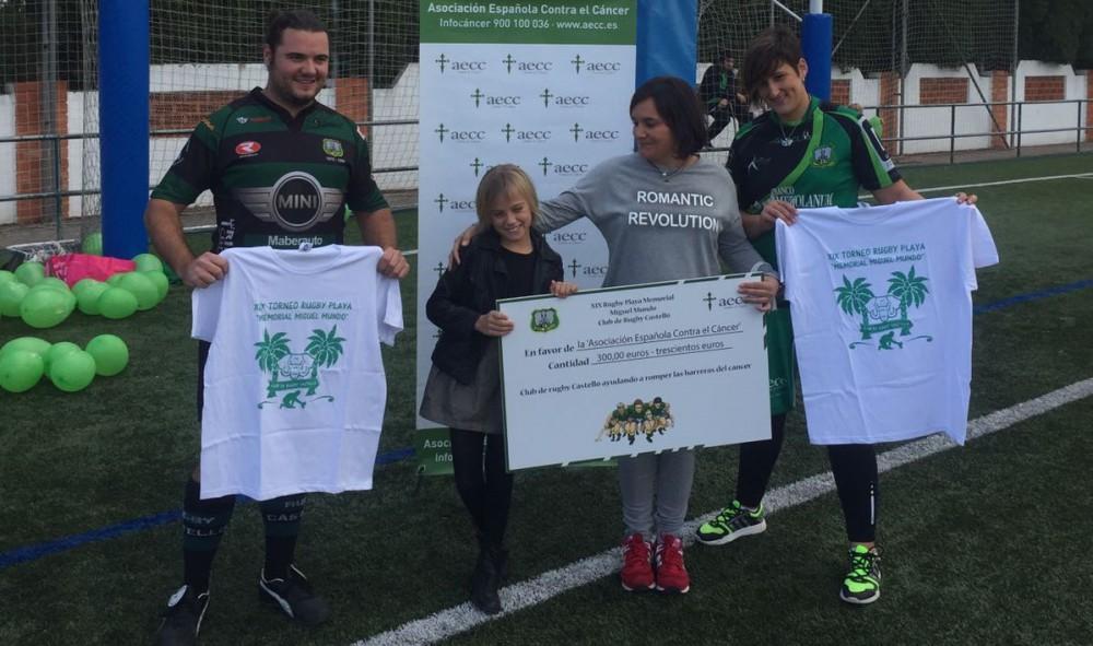 En los prolegómenos del partido de liga que enfrentaba al C.R. Castelló frente al Tavernes R.C., el Club de Rugby Castelló hizo entrega a la Asociación de Lucha Contra el Cáncer de un talón con un importe de 300 euros. Este importe fue recaudado durante el XIX Torneo rugby playa Memorial Miguel Mundo celebrado este verano. Una muestra de la solidaridad de este equipo con la sociedad.