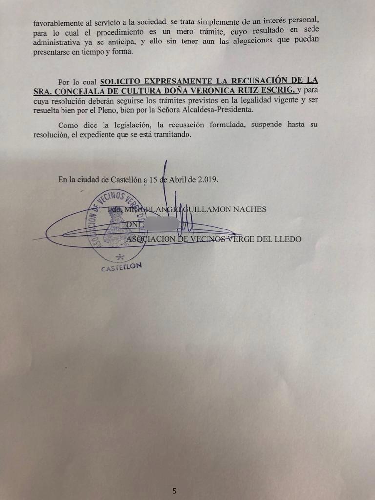 Por todo ello, finaliza el escrito: “solicito expresamente la recusación de la Sra. Concejala de Cultura Dña Verónica Ruiz Escrig, y para cuya resolución deberán seguirse los trámites previstos en la legalidad vigente y ser resuelta bien por el pleno, bien por la señora alcaldesa presidenta”.