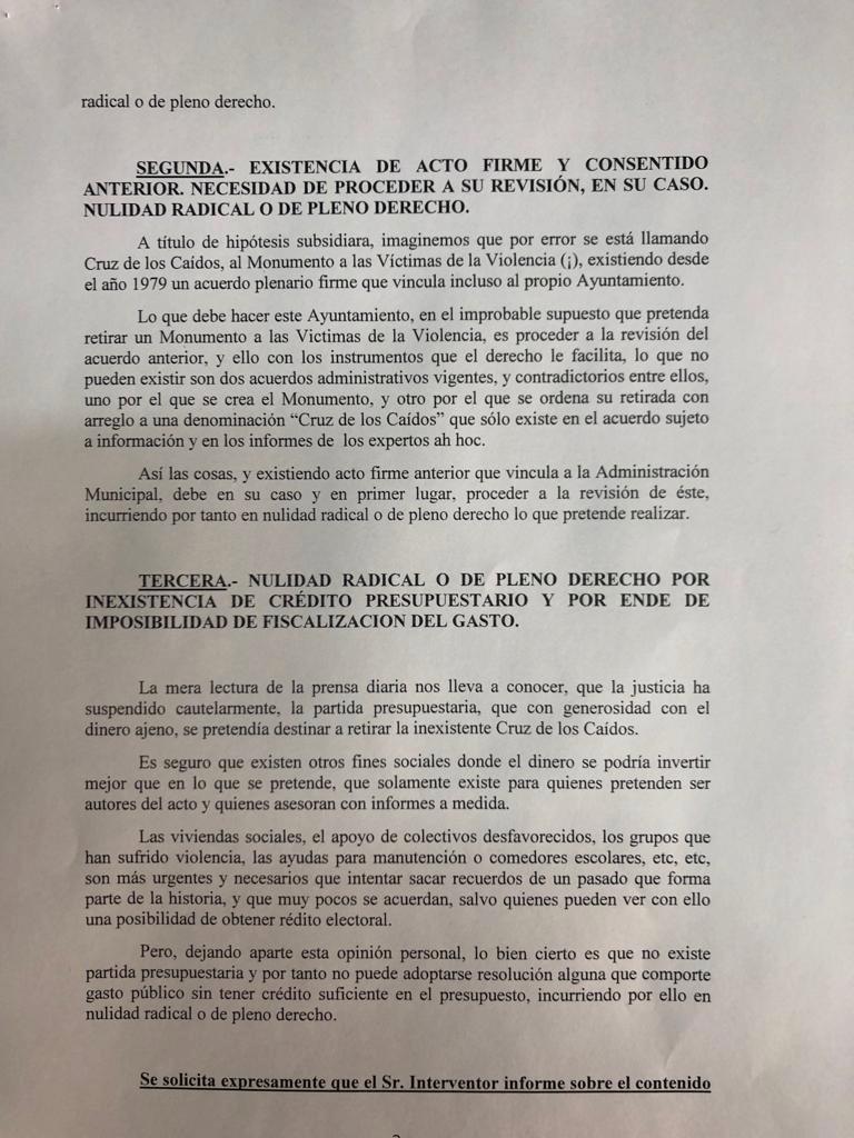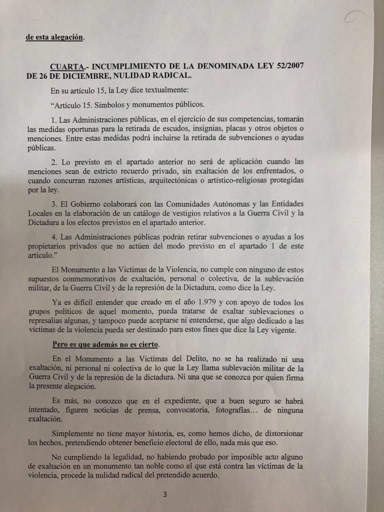 En el folio tres de la alegación, también se rechaza la aplicación e la Ley de Memoria Histórica en este caso, ya que frente al citado monumento no se han realizado exaltaciones franquistas, tal como confirmó en su momento un informe de la subdelegación del Gobierno.