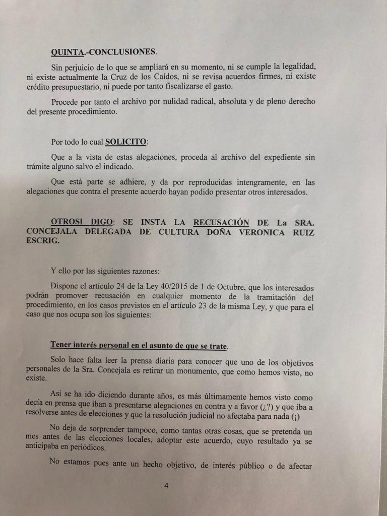 Por todo ello, la alegación presentada solicita el archivo del expediente que se tramita, pero además pide la recusación de la concejal de Cultura, por las numerosas declaraciones realizadas en la que afirma que el tema de la Cruz es de su ‘interés personal’, por lo que la gestión realizada no se ajusta al interés público sino a los suyos personales “para lo cual, el procedimiento es un mero trámite cuyo resultado en sede administrativa ya se anticipa y ello sin tener aun las alegaciones que puedan presentarse en tiempo y forma”.