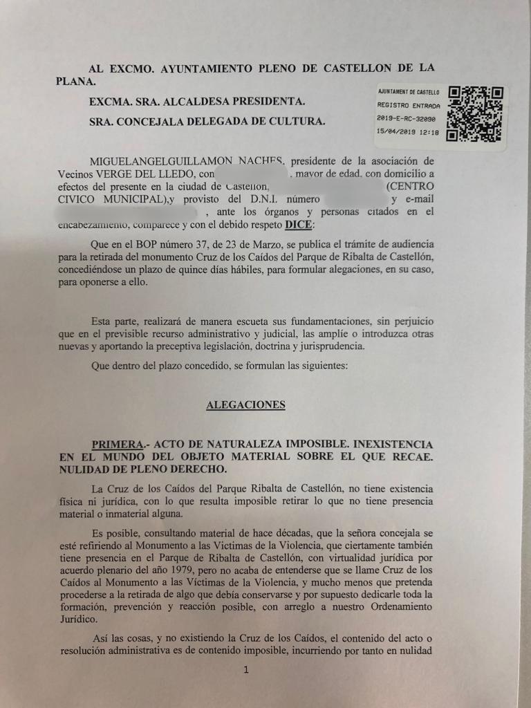 Una de estas recusaciones, presentada por la Asociación Verge de Lledo, alega contra el expediente de retirada de la Cruz en atención a que: