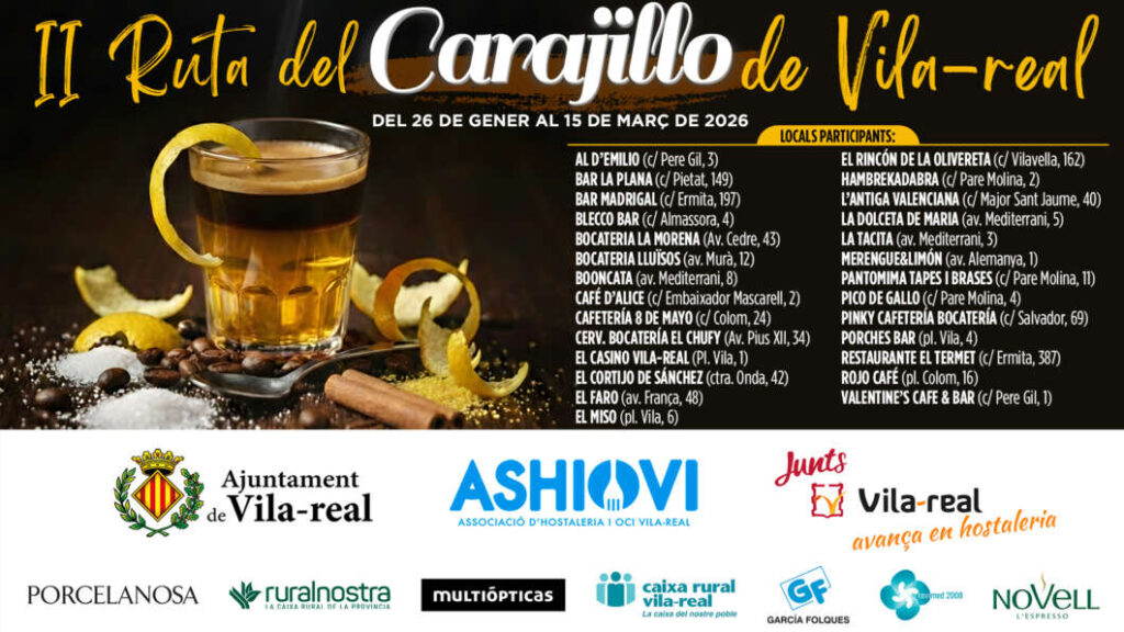 Després del gran èxit de la primera edició, Vila-real torna a acollir la Ruta del Carajillo, una iniciativa impulsada per la Regidoria de Comerç i Hostaleria en col·laboració amb l’Associació d’Hostaleria i Oci de Vila-real (ASHIOVI), que consolida aquesta proposta com una cita destacada dins del calendari gastronòmic local. La segona Ruta del Carajillo de Vila-real s’inicia avui i, fins al 15 de març, compta amb la participació de 27 establiments, cinc més que en l’edició anterior, que oferiran les seues millors versions d’aquesta beguda tan emblemàtica, convidant la ciutadania a gaudir d’una experiència única en cada parada.