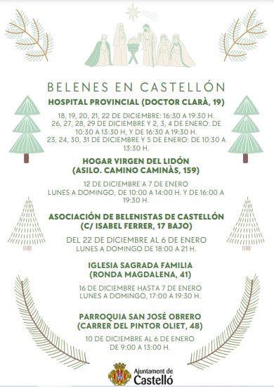 Una amplia agenda de actividades a las que se suma una de las decoraciones más típicas de estas fechas: los belenes. La ciudad de Castelló cuenta con un total de nueve pesebres repartidos por distintos espacios, entre los que destaca el instalado en la concatedral de Santa María, la basílica de la Mare de Déu del Lledó o el de la Asociación de Belenistas de Castelló.