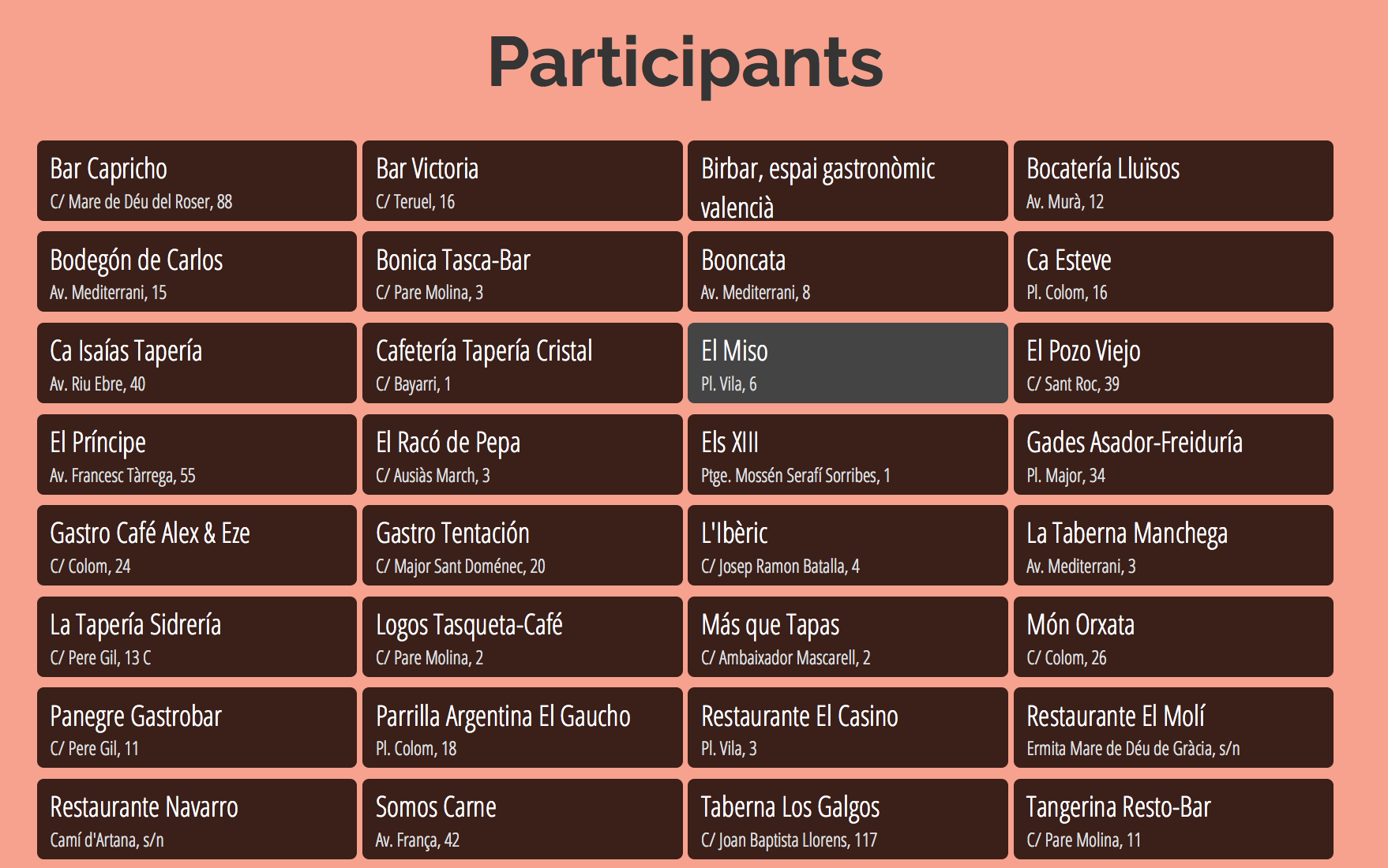Enguany són quatre restaurants més els que se sumen a la cita. “Enguany, amb més locals i amb una setmana més en marxa, estem segurs que la Ruta de la Tapa tornarà a superar-se”, indica Vila, qui assegura que el fet que l'última setmana coincidisca amb el Festival Internacional de Teatre (FIT) de Carrer “ajudarà encara més al fet que augmente el nombre de consumidors en els establiments hostalers".