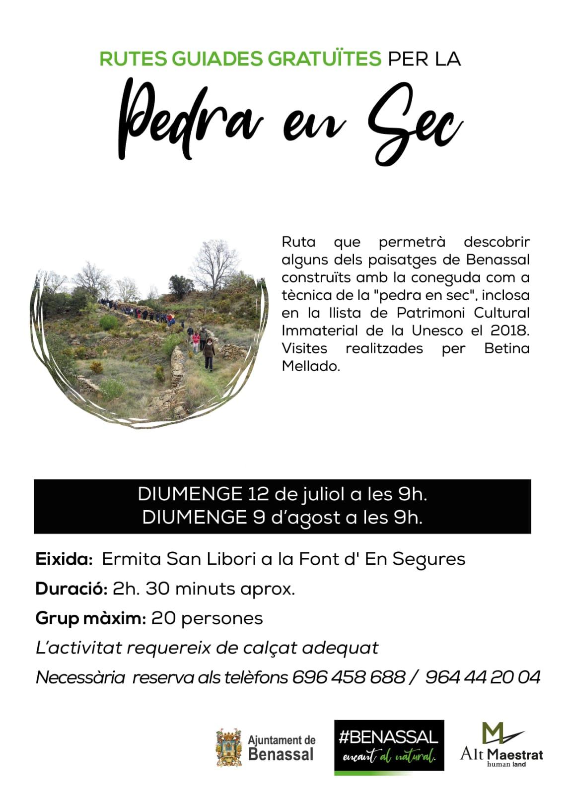 D'aquesta manera es duran a terme dues rutes guiades gratuïtes per a conéixer paisatges de Benassal construïts gràcies a la tècnica de la pedra en sec. Concretament, els diumenges 12 de juliol i 9 d'agost. Betina Mellado explicarà als visitants els secrets d'aquesta tècnica constructiva inclosa en la llista de Patrimoni Cultural Immaterial de la Unesco. L'activitat, que necessita inscripció prèvia (696 458 688 / 964 44 20 04), tindrà l'eixida a les 9h des de l'ermita de Sant Libori a la Font d'en Segures. La durada aproximada és de 2 hores i mitja.