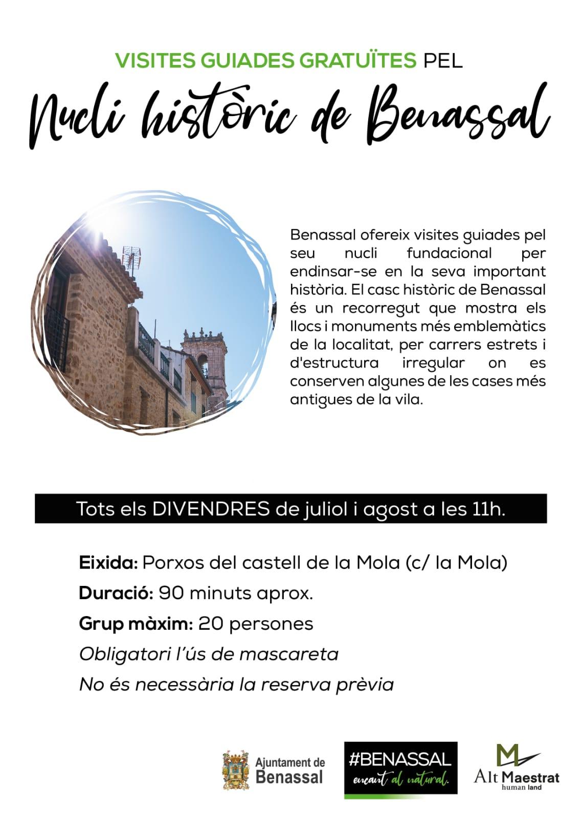 A més, Benassal ofereix visites guiades gratuïtes per a conèixer el seu barri antic, amb els seus carrers, les seues cases més antigues i els seus monuments més emblemàtics. La proposta tindrà lloc cada divendres de juliol i agost des de les 11h. Amb una duració aproximada de 90 minuts, l'eixida serà dels porxos del castell de la Mola. Serà obligatori l'ús de mascareta.