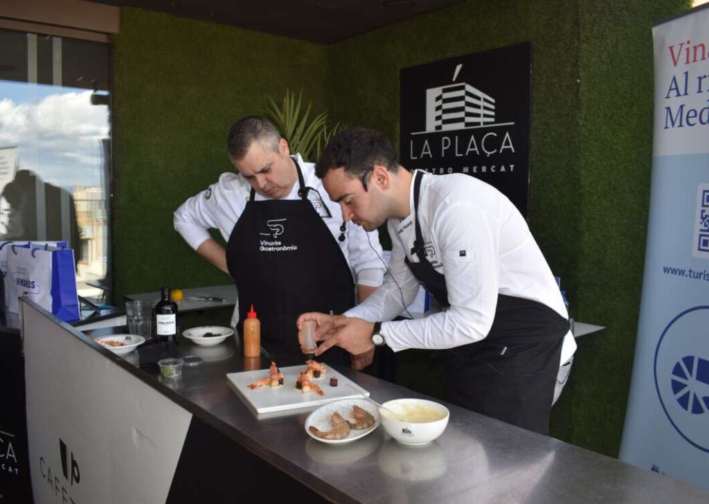 Los chefs Ángel Prados y Agustí Marcos de l'Associació Vinaròs Gastronòmic, han sido los encargados de elaborar la receta del plato con el producto del mes: 'Langostino de Vinaròs, apionabo y escabeche de especias'