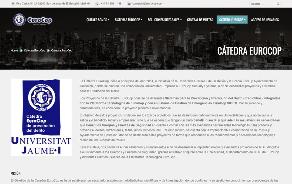 Es cierto que Eurocop ha tenido una presencia importante en la capital de la plana. En la legislatura de 2011 (2014), cuando gobernaba el PP, Eurocop financió la Cátedra de Seguridad de la UJI, a través de la cual se promocionó una aplicación y un sistema novedoso, el Proxpol, para el estudio de la delincuencia y la eficacia de una policía de seguridad.