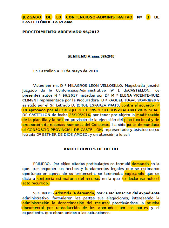 Y es que hay que tener en cuenta que la sentencia del Juzgado de lo Contencioso-Administrativo número 1 de Castellón estima el recurso interpuesto por la diputada de Acción Social y consejera del Provincial, Elena Vicente-Ruiz, y anula todos los despidos contemplados en el acuerdo del punto nº10 del Consejo de Gobierno del Consorcio Hospitalario Provincial celebrado el 25 de octubre de 2016.