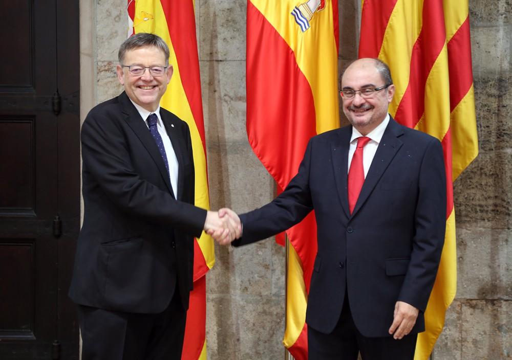 FOTO_REUNION_PUIG_Y_LAMBAN_02Asimismo, el President de la Generalitat, Ximo Puig, y el presidente del Gobierno de Aragón, Javier Lambán, han anunciado que ambas comunidades autónomas han acordado forjar una "alianza estratégica" que permita avanzar en la vertebración de dos territorios "con gran actividad comercial y un enorme peso y potencial logístico" e impulsar, de ese modo, un eje cántabro-mediterráneo que una los puertos de Valencia y Bilbao a través de Teruel y Zaragoza.
