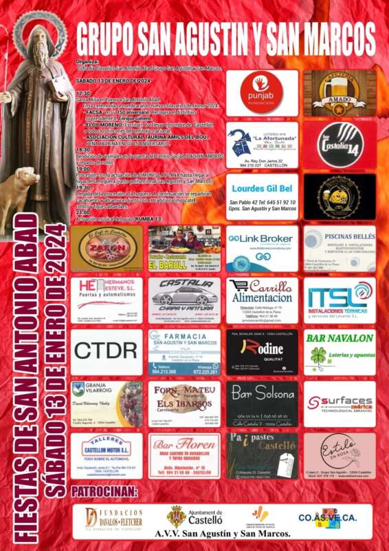 Los grupos San Agustín y San Marcos, Benadresa y los vecinos de la zona del Meridiano serán los primeros en celebrar San Antonio durante la jornada de mañana. Serán los primeros, pero no los únicos, ya que las celebraciones en honor al santo se sucederán a lo largo de todo el mes de enero y principios del mes de febrero con el siguiente calendario: