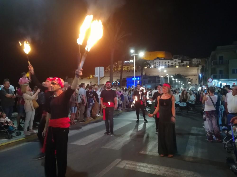 A las once de la noche, dio comienzo una de las citas más multitudinarias del verano, la ya consolidada batukada nocturna que conduce con la percusión, a los vistantes hacia la Playa Sur. El pasacalle combinó ritmos, zancos, danzas y trucos con fuego para llegar hasta la gran hoguera.