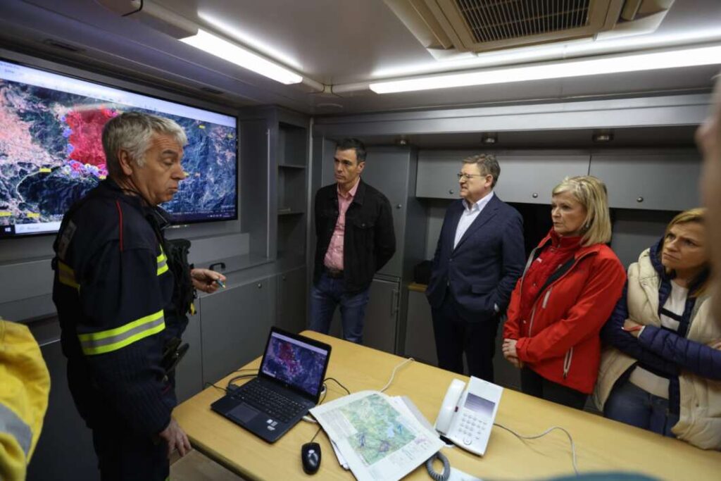 El presidente del Gobierno ha visitado el Puesto de Mando Avanzado en Barracas para conocer la última hora del incendio, acompañado por el president de la Generalitat, Ximo Puig