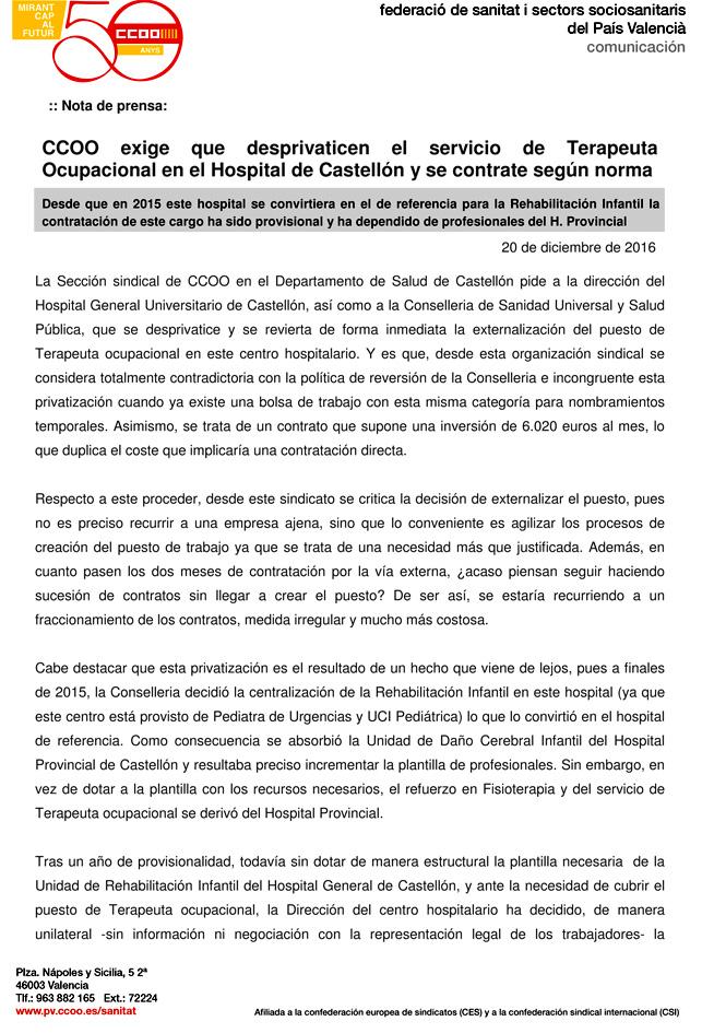 “CCOO exige que desprivaticen el servicio de Terapeuta Ocupacional en el Hospital de Castellón y se contrate según norma”