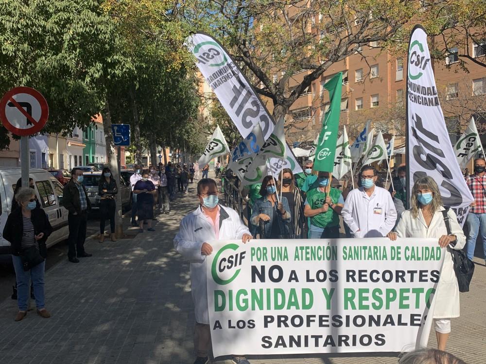 Personal sanitario de los centros de salud han respaldado las concentraciones convocadas por los sindicatos, en las tres provincias, con el objetivo de mostrar su malestar por las insuficientes medidas tomadas por la conselleria de Sanitat para mitigar el colapso de la Atención Primaria durante la pandemia. El CSIF, junto al resto de sindicatos convocantes, ha vuelto a exigir a la administración sanitaria “un plan estructural que refuerce de forma permanente la Atención Primaria y que aborde los cambios de aumento de plantilla y de organización que necesita”