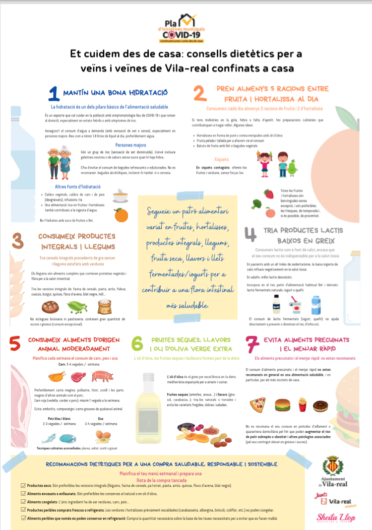 El manual 'Et cuidem des de casa',realitzat en col·laboració amb la nutricionista vila-realenca Sheila Llop, també compta amb pautes dietètiques per a realitzar una compra saludable, responsable i sostenible, a més d'alguns consells específics per a les persones de risc.