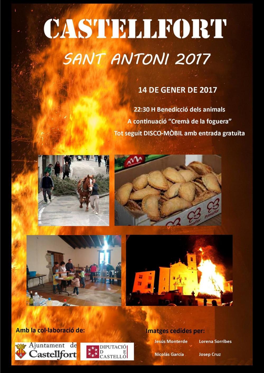 El muntatge de la foguera va portar als majorals tot el matí. Arribada l'hora del sopar, tots es van reunir al local de la confraria on van sopar. Després es va celebrar la benedicció dels animals a la qual va seguir el repartiment dels pastissos i l'encesa de la foguera. Amb un fred intens la pira va cremar a la plaça davant les mirades de tots els presents.