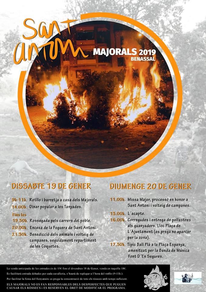 El dissabte l'entrada de cavalls amb la llenya per a la foguera, la ’plantà del pi' i la crema i el diumenge esmorzar popular i benedicció d'animals i repartiment de rotllos