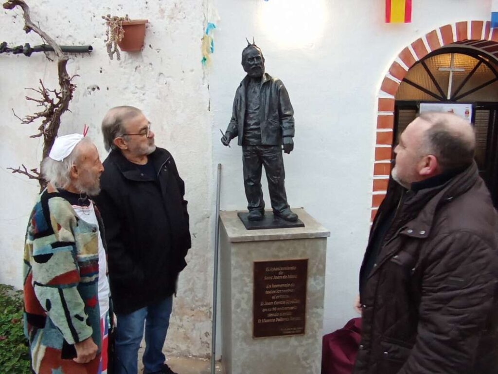 El Ayuntamiento de Sant Joan de Moró ha rendido un nuevo homenaje a Joan Ripollés, y lo ha hecho en la pedanía de Mas de Flors, donde el artista tiene su casa y su estudio. Allí se ha instalado una escultura en la plaza que ya lleva su nombre con la figura del siempre polifacético creador, idéntica a la que ya tiene en la plaza Joan Ripollés de Moró, aunque en esta ocasión es de dimensiones más reducidas. “Ambas figuras son idénticas y son obras del escultor José Manuel García Cerveró, conocido por todos como Jere. La primera, la que se puede admirar en el casco urbano de Sant Joan de Moró desde hace dos años, mide dos metros, y la que hemos instalado en Mas de Flores es de un metro”, explica el alcalde, Vicente Pallarés.