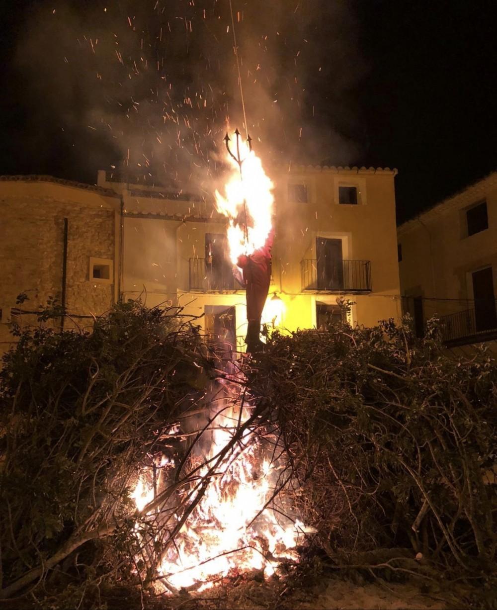 Els actes matinals van acabar amb el muntatge de la foguera, on, per la vesprada, es va cremar el dimoni. Prèviament, va tindre lloc la desfilada de dimonis acompanyats pel carro de les lloes i el grup de Bombos i Tambors de Sant Jordi. A l'arribar a la plaça, els alumnes i alumnes del CEIP Luis Tena van exercir de loeros i van conquistar el públic congregat en l'àgora amb les seues agudes creacions en vers.