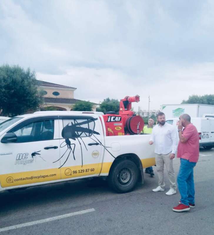 El alcalde, Iván Sánchez Cifre, acompañado por el concejal Juan Carlos Esteller, han comprobado hoy los trabajos de tratamiento contra el insecto en su fase adulta con cañón. "Estamos teniendo un verano especialmente complicado con la cantidad de mosquitos que hay, un problema que no es aislado en Sant Jordi, y para el que desde el Ayuntamiento estamos destinando todos nuestros recursos, intensificando los tratamientos. Realizamos las labores oportunas en lugares sensibles y aplicamos los tratamientos más efectivos en cada fase de desarrollo para tratar de minimizar la presencia del mosquito tigre en Sant Jordi. Un trabajo que desarrollamos durante todo el año y en esta época especialmente", ha asegurado el alcalde.