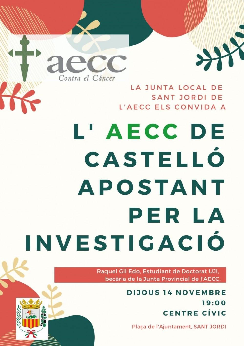 La Junta Local de l'Associació Espanyola Contra el Càncer (AECC), amb la col·laboració de l'Ajuntament de Sant Jordi, ha organitzat una conferència que tindrà lloc dijous 14 de novembre en el centre cívic. La ponent serà Raquel Gil Edo, estudiant de Doctorat de la Universitat Jaume I de Castelló i integrant de la Junta Provincial de la AECC.