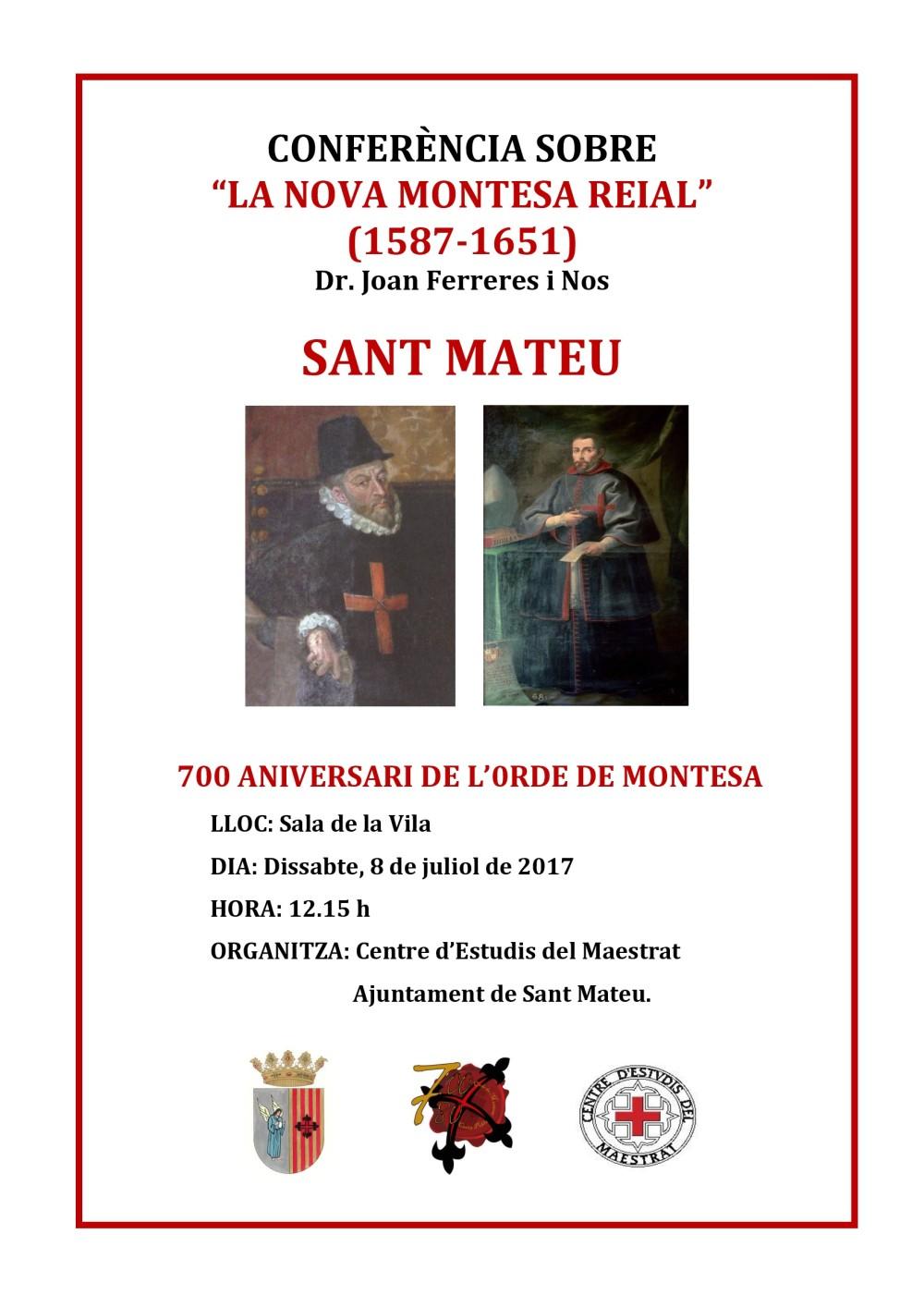 Dins de les activitats culturals programades en el Sant Mateu Medieval 2017, el professor de la Universitat Jaume I Joan Ferreres i Nos oferirà una conferència titulada 'La nova Montesa reial (1587-1651)'. Aquesta xarrada s'engloba en el 700 aniversari de la fundació de l'Orde de Montesa, tindrà lloc dissabte 8 de juliol a les 12.15 h a la Sala de la Vila i està organitzada pel Centre d'Estudis del Maestrat i l'Ajuntament de Sant Mateu.