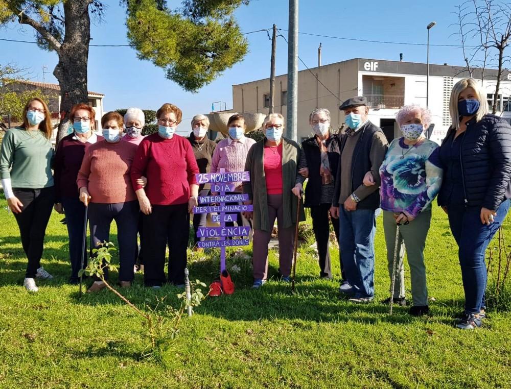 Las personas mayores de Sant Rafel del Riu han colocado unos carteles en la rotonda situada frente la casa consistorial con los nombres de mujeres asesinadas por hombres con motivo del Día Internacional contra la Violencia Machista, que se celebra este miércoles 25 de noviembre.