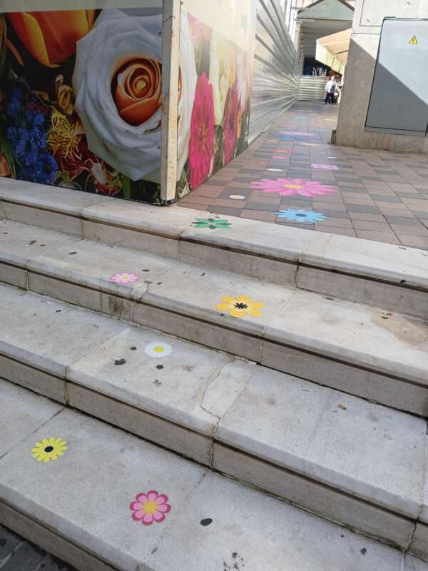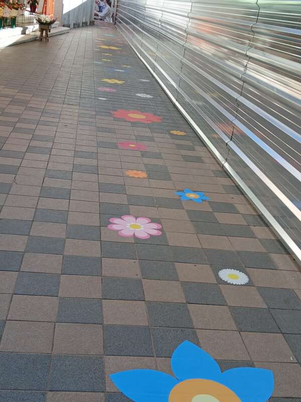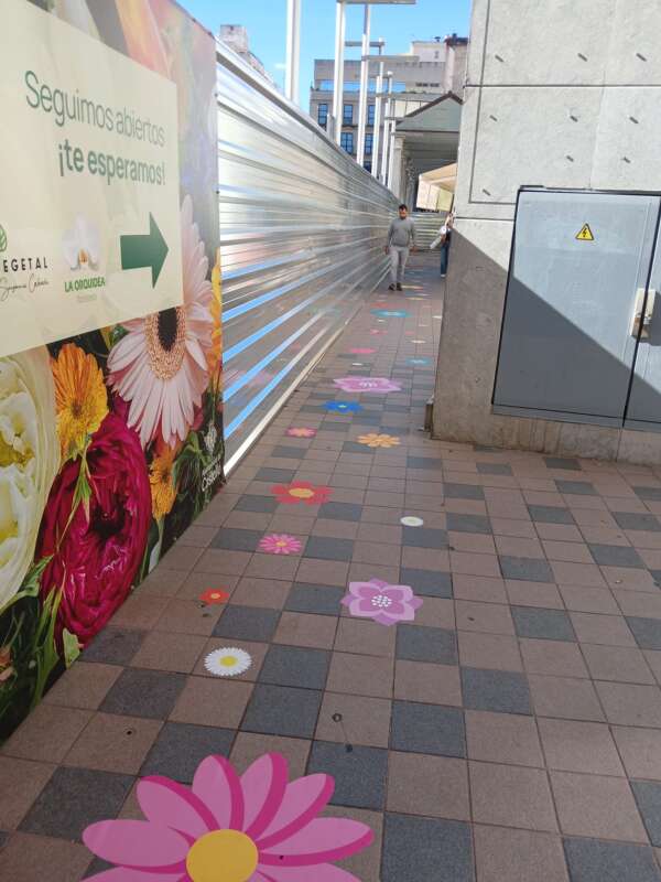 Además, se ha señalizado el acceso con vinilos decorativos de flores en el suelo, creando un recorrido visual para guiar a los viandantes hasta las floristerías que prestan servicio en esta céntrica plaza.
