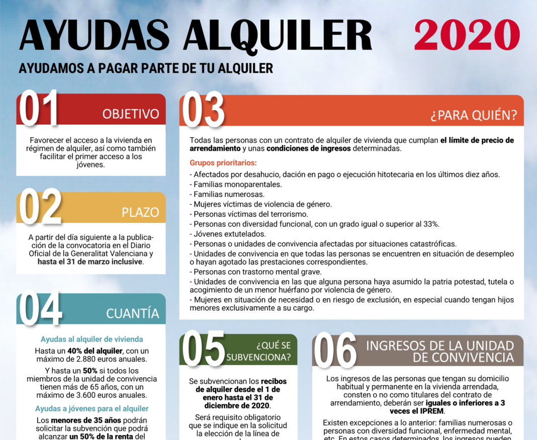 El departament de Serveis Socials informa que, la Vicepresidència segona i Conselleria d'Habitatge i Arquitectura Bioclimàtica de la Generalitat ha obert el termini per a sol•licitar el programa d'ajudes al lloguer d'habitatges 2020, amb l'objectiu d'afavorir l'accés a l'habitatge en règim de lloguer, així com també facilitar el primer accés als joves.
