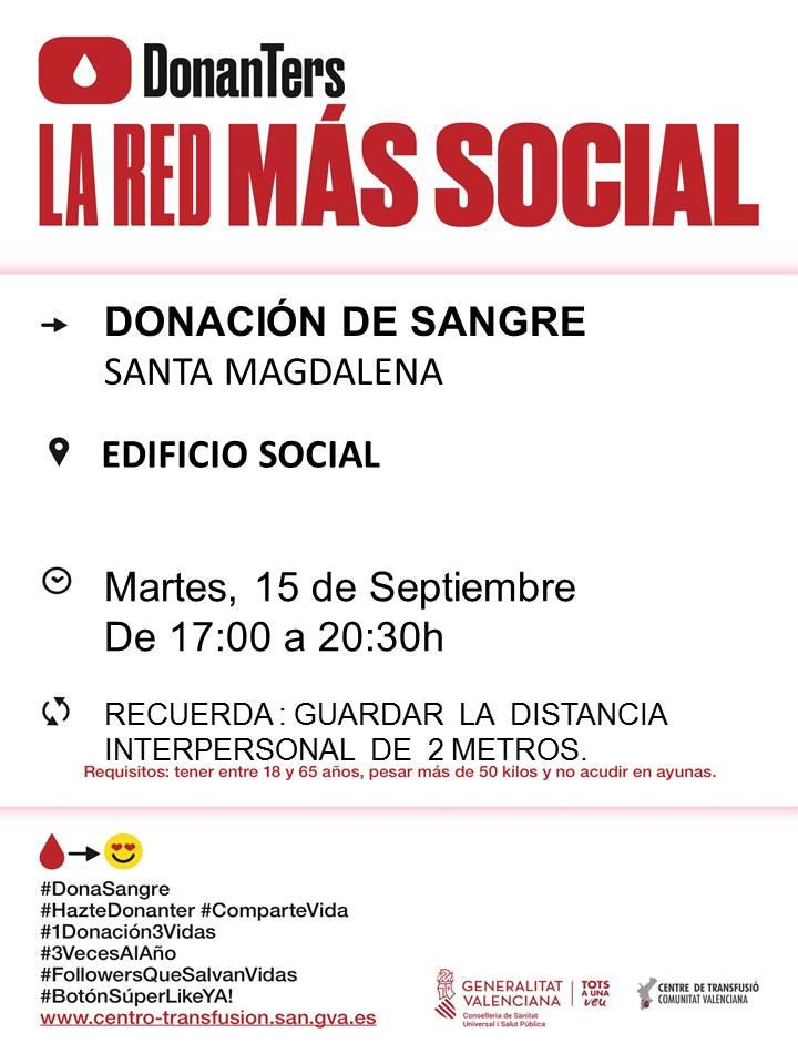 L'Ajuntament de Santa Magdalena informa que dimarts que ve, 15 de setembre, tindrà lloc a l'Edifici Social de la localitat, una nova campanya de donació de sang, organitzada pel Centre de Transfusió de la Comunitat Valenciana. L'horari d'extracció de sang serà de 17 a 20.30h. Pot donar sang qualsevol persona sana, entre 18 i 65 anys, que pese més de 50 quilos.