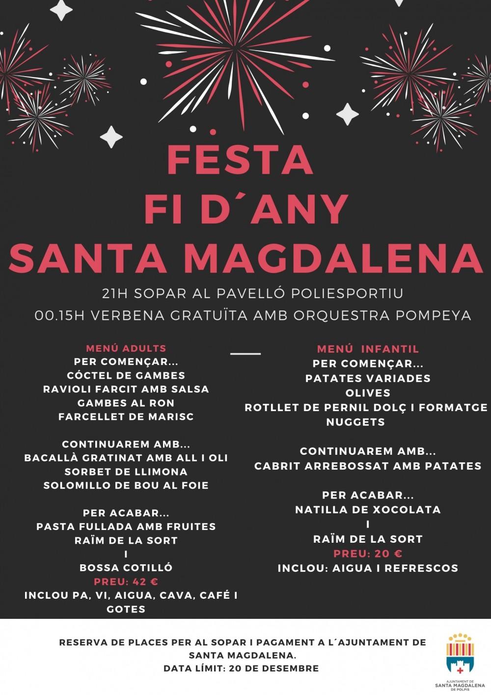 L'Ajuntament de Santa Magdalena està immers en els preparatius de la programació de Nadal, Any Nou i Reyes, un calendari d'activitats, que molt prompte es donarà a conéixer, però que compta com una de les seues principals novetats, el sopar que se servirà la nit de Cap d'any. D'aquesta manera, el dia 31 de desembre, a partir de les 21h, hi haurà un sopar en el poliesportiu municipal, amb menú tant d'adults com infantil. El preu del menú adult és de 42€ i inclou uns aperitius a base de còctel de gambes, ravioli farcit amb salsa, gambes al rom i bosseta farcida de marisc. D'altra banda hi haurà bacallà gratinat amb all i oli, sorbet de llima i solomillo de bou al foie. Les postres són pasta fullada amb fruites. A més s'inclouen raïms de la sort i bossa cotillón. En el preu del menú va inclòs el pa, vi, cava, café i gotes.